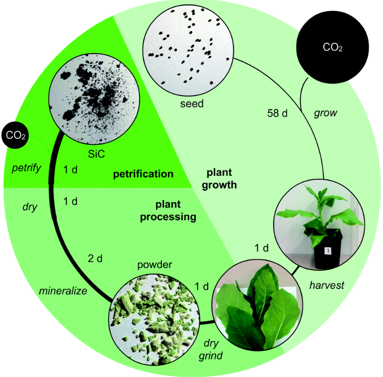 本次研究人員利用農(nóng)業(yè)植物捕獲二氧化碳,再將其轉(zhuǎn)化為具有經(jīng)濟(jì)價(jià)值的綠色產(chǎn)品,主要過程為:首先,研究人員從種子中種植煙草,選擇煙草生長季節(jié)較短。然后他們將收獲的植物冷凍并磨成粉末,然后用包括含硅化合物在內(nèi)的幾種化學(xué)物質(zhì)進(jìn)行處理。在第三個(gè)也是最后一個(gè)階段,粉狀植物被石化(變成石質(zhì)物質(zhì))來制造碳化硅,這個(gè)過程需要將材料加熱到1600℃。試驗(yàn)結(jié)果顯示14%的植物固碳最終以碳化硅的形式存在,研究團(tuán)隊(duì)還評(píng)估了能夠產(chǎn)生全球影響所需要的生產(chǎn)規(guī)模。