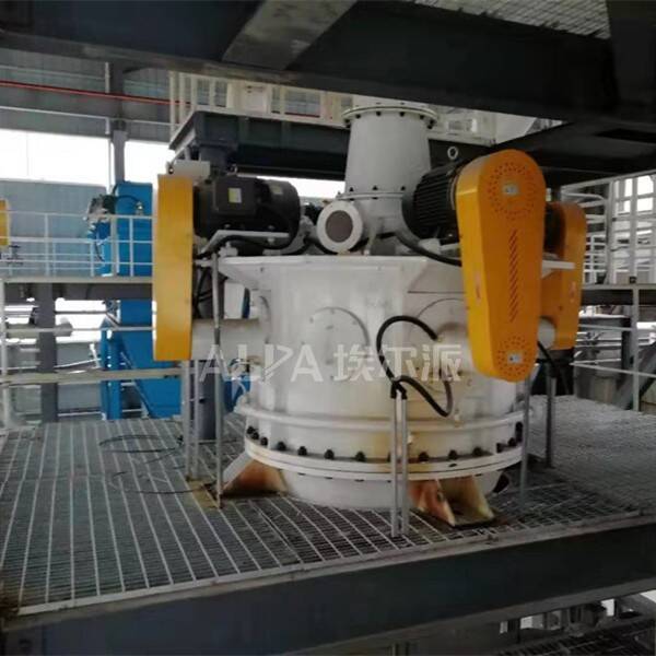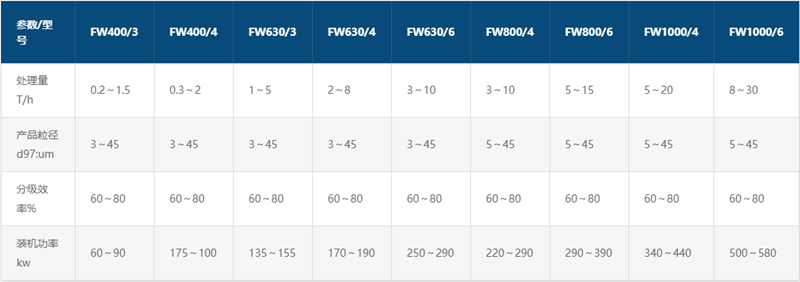 分級(jí)機(jī)與旋風(fēng)分離器、除塵器、引風(fēng)機(jī)組成一套分級(jí)系統(tǒng)。物料在風(fēng)機(jī)抽力作用下由分級(jí)機(jī)下端入料口隨上升氣流高速運(yùn)動(dòng)至分級(jí)區(qū),在高速旋轉(zhuǎn)的分級(jí)渦輪產(chǎn)生的強(qiáng)大離心力作用下,使物料分離,符合粒徑要求的細(xì)顆粒通過(guò)分級(jí)輪葉片間隙進(jìn)入旋風(fēng)分離器或除塵器收集。粗顆粒夾帶部分細(xì)顆粒撞壁后速度消失,沿筒壁下降至二次風(fēng)口處,經(jīng)二次風(fēng)的強(qiáng)烈淘洗作用,使粗細(xì)顆粒分離,細(xì)顆粒上升至分級(jí)區(qū)二次分級(jí),粗顆粒下降至卸料口排出。