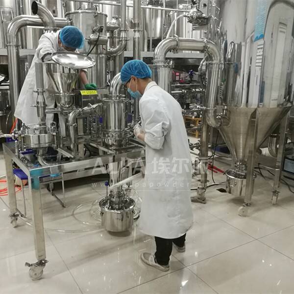 埃爾派MQP醫(yī)藥專用氣流粉碎機(jī)與旋風(fēng)分離器、除塵器、引風(fēng)機(jī)組成一整套粉碎系統(tǒng)。壓縮空氣經(jīng)過濾干燥后,通過拉瓦爾噴嘴高速噴射入粉碎腔,在多股高壓氣流的交匯點(diǎn)處物料被反復(fù)碰撞、磨擦、剪切而粉碎,粉碎后的物料在離心力的作用下,使粗細(xì)物料分離,符合粒度要求的細(xì)顆粒通過分級區(qū)進(jìn)入旋風(fēng)分離器和除塵器收集,粗顆粒返回粉碎區(qū)繼續(xù)粉碎。