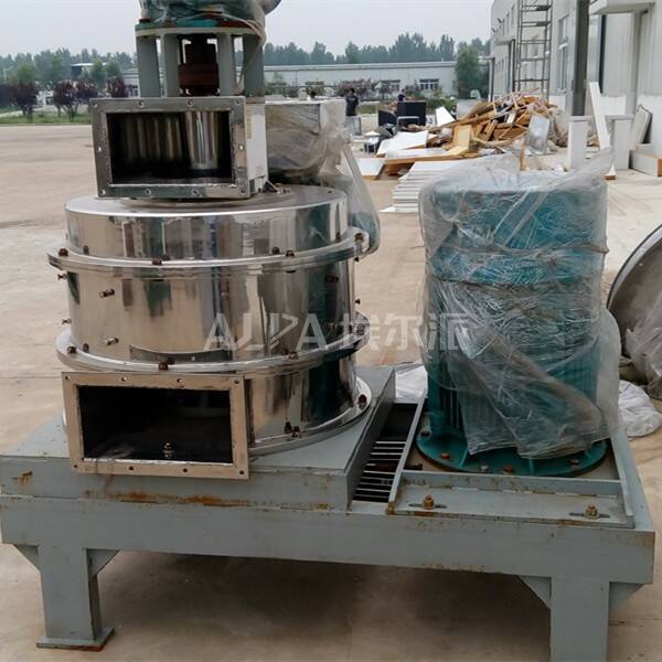 物料由加料系統(tǒng)均勻的送入粉碎室,受到高速旋轉(zhuǎn)的粉碎盤的強(qiáng)烈沖擊,同時(shí)受到離心力的作用,與粉碎齒圈發(fā)生碰撞,受到剪切、摩擦、碰撞等多種綜合力的作用,使物料粉碎,被粉碎的物料隨氣流運(yùn)動(dòng)到分級(jí)區(qū),通過變頻調(diào)節(jié)的分級(jí)輪,對(duì)粗細(xì)物料進(jìn)行分離,符合細(xì)度要求的產(chǎn)品隨氣流進(jìn)入旋風(fēng)收集器和除塵器收集,粗細(xì)料返回分級(jí)區(qū)二級(jí)粉碎。