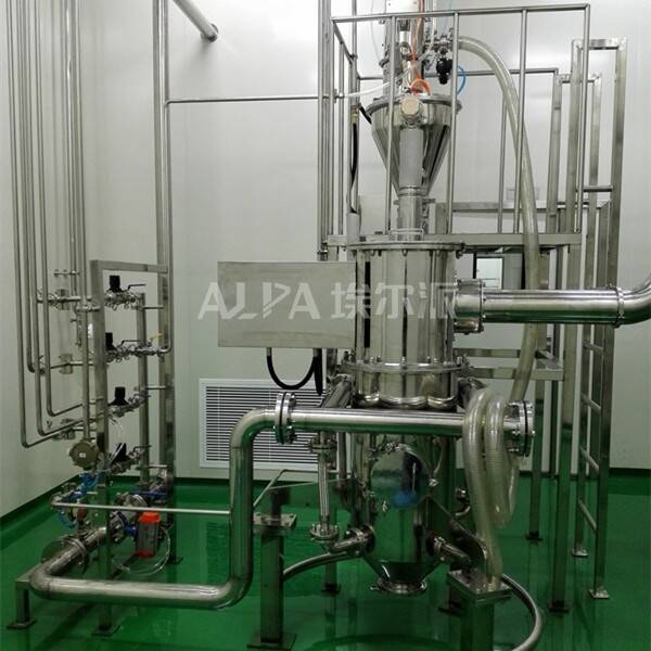 氣流粉碎機與旋風(fēng)分離器、除塵器、引風(fēng)機組成一整套粉碎系統(tǒng)。壓縮空氣經(jīng)過濾干燥后,通過拉瓦爾噴嘴高速噴射入粉碎腔,在多股高壓氣流的交匯點處物料被反復(fù)碰撞、磨擦、剪切而粉碎,粉碎后的物料在風(fēng)機抽力作用下隨上升氣流運動至分級區(qū),在高速旋轉(zhuǎn)的分級渦輪產(chǎn)生的強大離心力作用下,使粗細物料分離,符合粒度要求的細顆粒通過分級輪進入旋風(fēng)分離器和除塵器收集,粗顆粒下降至粉碎區(qū)繼續(xù)粉碎。